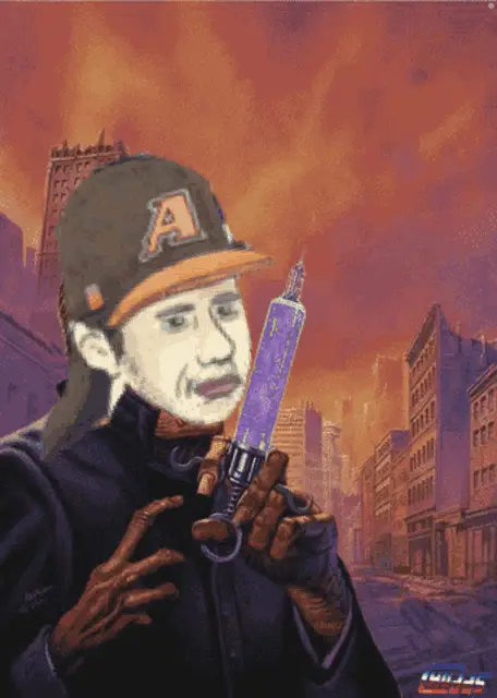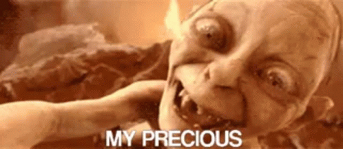 Gollum from Lord of the Rings exclaims 'My Precious' while holding the Elrond (Erd) symbol in a fiery landscape.