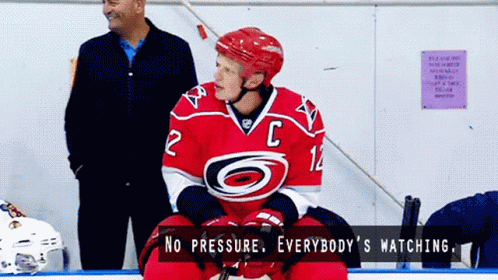 Hockey player Eric Staal, wearing his Carolina Hurricanes jersey, sits on the bench with the caption 'No pressure. Everybody's watching.'