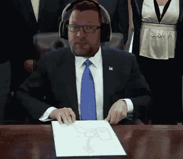 Eric Taylor, wearing a suit and headphones, sits at a desk and holds up a hand-drawn diagram.
