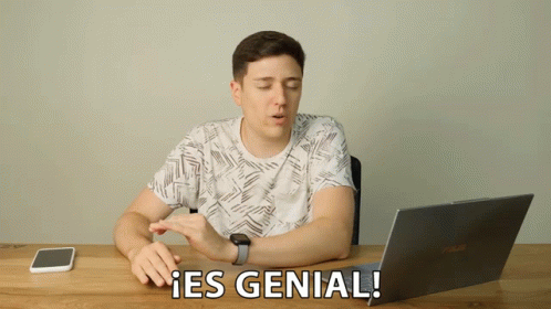 A man from Suprapixel sits at a desk with a laptop, enthusiastically exclaiming '¡Es Genial!' with a smile.