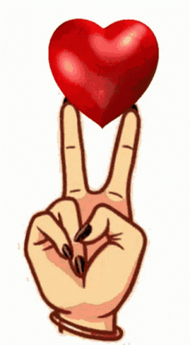 A cartoon hand with black nail polish makes a peace sign, holding a vibrant red heart between its fingers. Dedicated to Es Tuyo Cers.