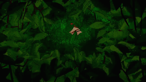 Gwen, from Ben 10, peeks through dense green leaves with a suspicious and slightly annoyed expression.