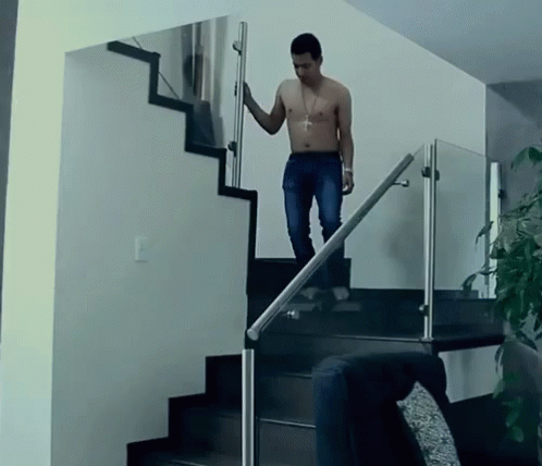 Ariel Camacho walks down a modern staircase shirtless, holding the glass railing.