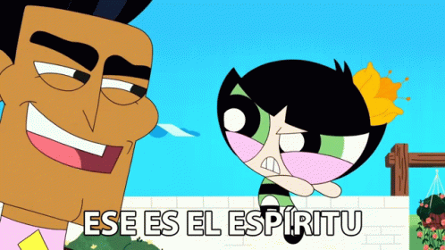 Bellota (Buttercup) reacts with a frustrated expression as a man smiles, with the caption 'Ese Es El Espíritu' (That is the spirit).