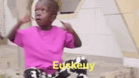 Young boy Eskey Euskeuy in a pink shirt and patterned pants, sitting.