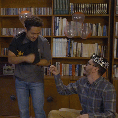 Memo Villegas, wearing a crown, shares a celebratory fist bump with another man in a library setting.