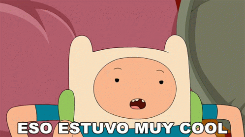 Finn from Adventure Time exclaims 'Eso Estuvo Muy Cool' with an open mouth, showing a surprised reaction.