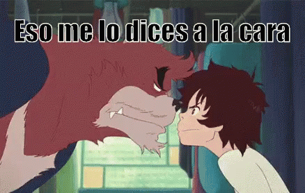 An anime boy confronts a wolf-like creature, shouting 'Say that to my face' in a heated argument.
