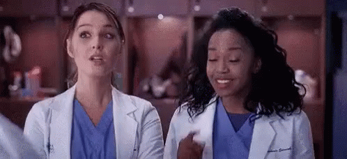Two doctors from Grey's Anatomy react enthusiastically, pointing and smiling, expressing strong interest.