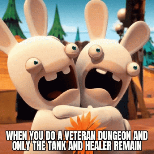 Two Rabbids react to a veteran dungeon situation where only the tank and healer are left.