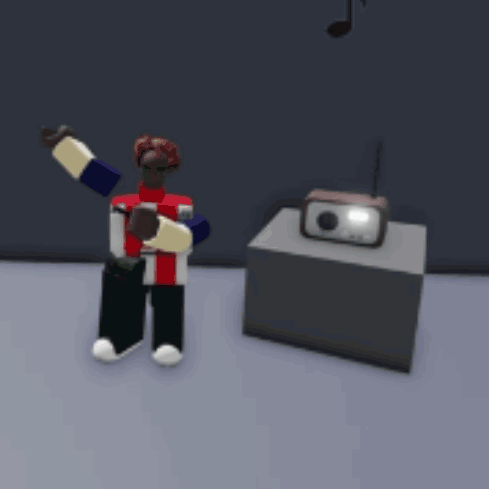 Roblox character Don Pollo dancing to music from a radio, performing the 'Eso Tilin' move.