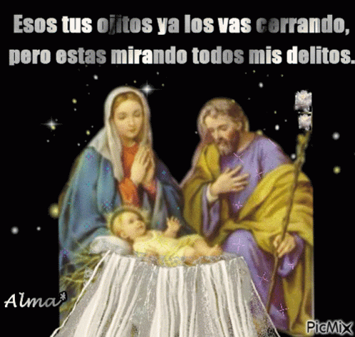 A Nativity scene featuring Baby Jesus, Mary, and Joseph, accompanied by a Spanish quote about watching misdeeds.