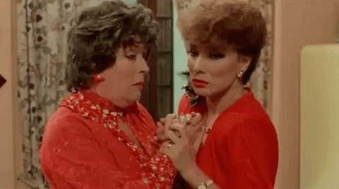 Nora and Elvira hold hands, looking concerned in a scene from the classic Argentine film Esperando La Carroza.