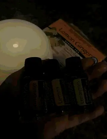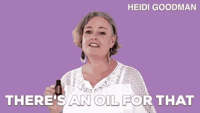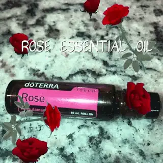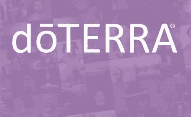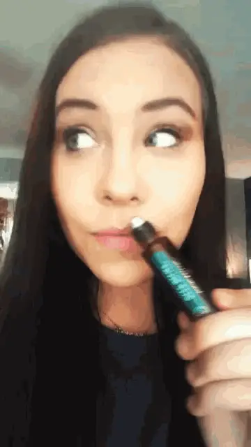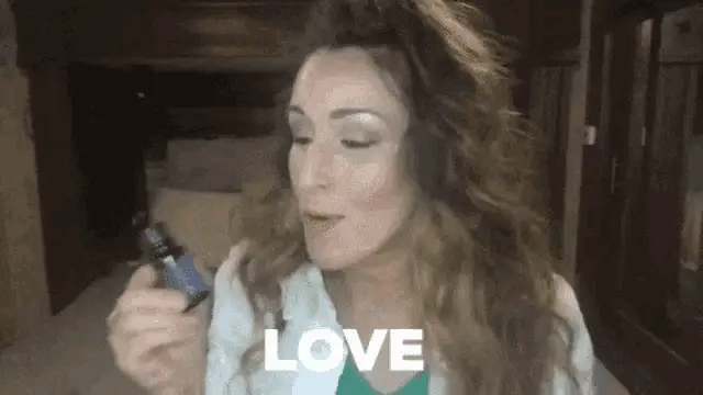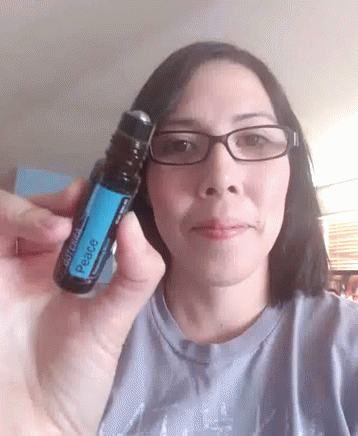 Woman in glasses applies Doterra Peace essential oil from a roller bottle to her neck.