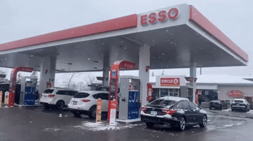 An Esso and Circle K gas station with cars parked, covered in a light snowfall during winter.