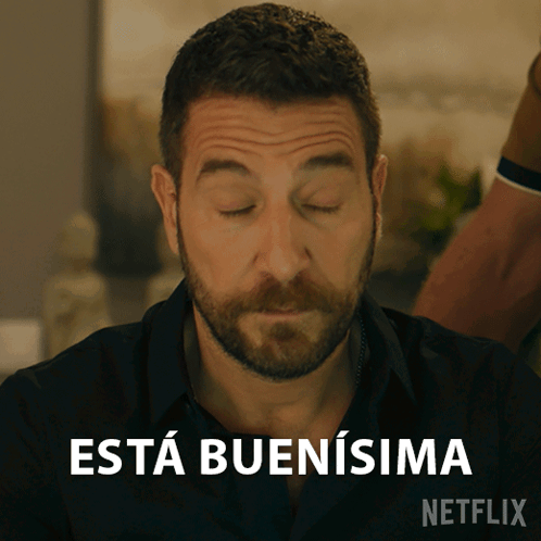 Raúl exclaims "Está Buenísima" in a Netflix advertisement, reacting positively to something unseen.