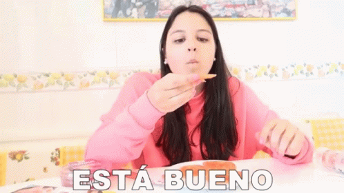Woman in pink sweater enjoying tasty food with 'Está Bueno' caption, expressing satisfaction with the meal.