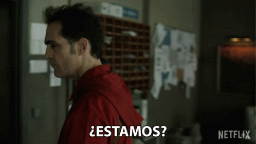 Pedro Alfonso in a red shirt asks 'Are we clear?' in a scene from a Netflix production.