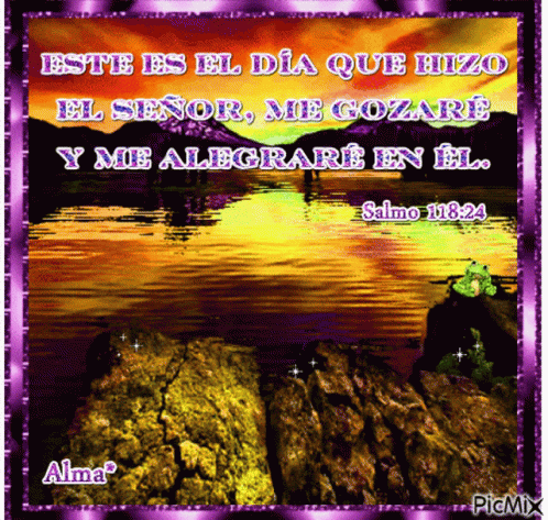 Animated sunset scene with a quote from Psalm 118:24 in Spanish, featuring sparkling water and rocks.