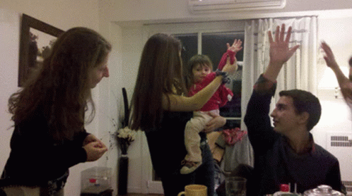 Estelita and family share a moment, with a man giving a high five, or "Mano Arriba".