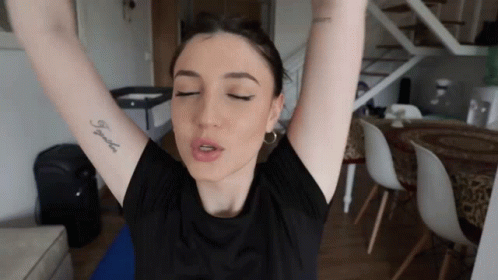 Amira Chediak stretching and exercising at home, with arms raised and eyes closed, focusing on calm.