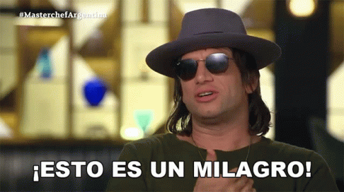 Joaquín Levinton exclaims 'This is a miracle!' on Masterchef Argentina, wearing a hat and sunglasses.