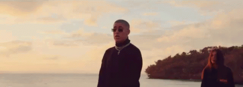 Bad Bunny and a woman on a beach at sunset, reflecting on a breakup and farewell.