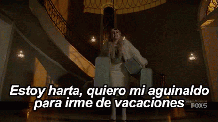 A woman from Scream Queens, dressed in a fur coat, declares she's fed up and wants her bonus for vacation.