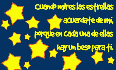 A romantic Spanish message displayed on a blue background with yellow stars, speaking of love and kisses.