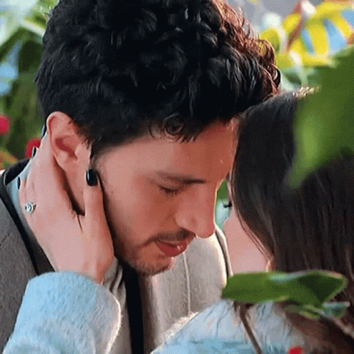 Eszan and Ozan Korfali share a tender, romantic moment, with her hand gently on his face.