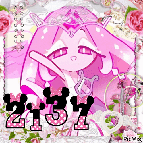 Eternal Sugar Cookie from Cookie Run Kingdom with the number 2137, surrounded by pink floral decor.