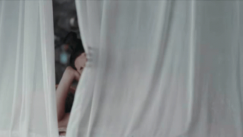 Ethan Ruan, shirtless, poses alluringly while peeking from behind white sheer curtains.
