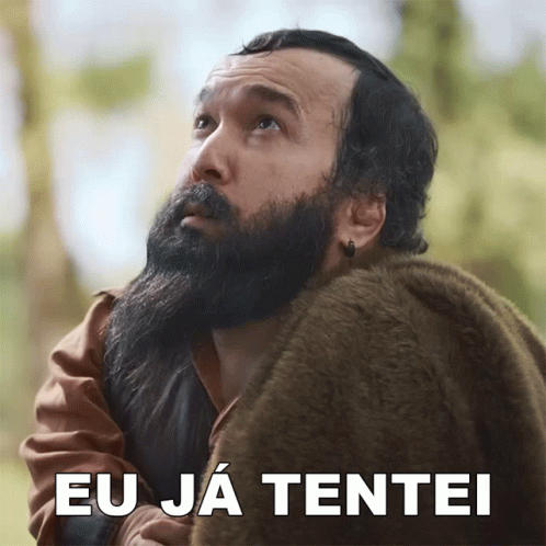 Gigante Léo from Porta Dos Fundos looks up thoughtfully with the caption 'Eu Já Tentei' (I Already Tried).