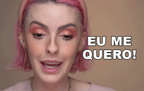 Karen Bachini, with pink hair and makeup, says 'Eu Me Quero!' promoting self-love and self-care.