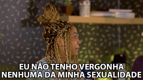 Woman with blonde braids confidently declares 'I have no shame of my sexuality' in Portuguese.