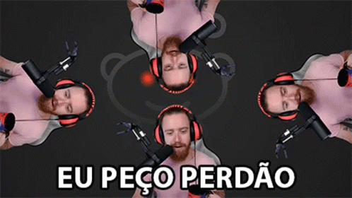Lubatv apologizes in a mirrored visual, wearing headphones and a microphone, with 'Eu Peço Perdão' text.