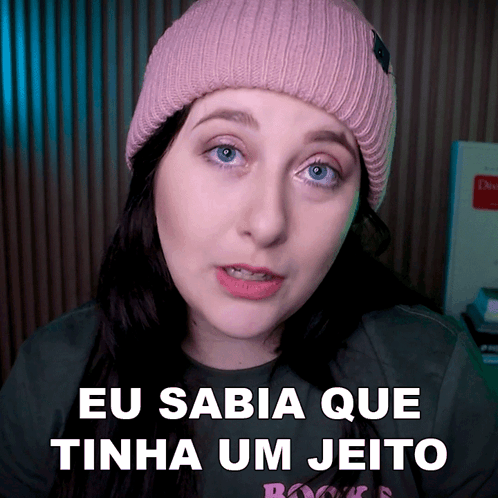 Anna Schermak, wearing a pink beanie, says "Eu sabia que tinha um jeito" (I knew there was a way) in Portuguese.