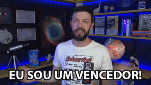 Schwarza, from Poligonautas, enthusiastically declares 'Eu Sou Um Vencedor!' in his science-themed room.