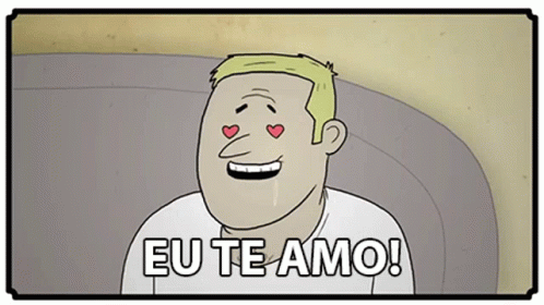 A cartoon man with hearts in his eyes and drooling, declaring 'Eu Te Amo!' or 'I Love You!'