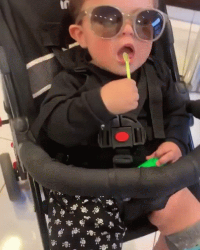 Baby Noah looking cool in sunglasses while sitting in a stroller and eating with a spoon.