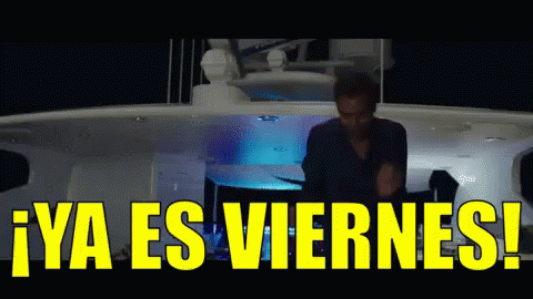 Eugenio Derbez celebrates the weekend by dancing energetically on a yacht, with the text 'It's Friday!' displayed.