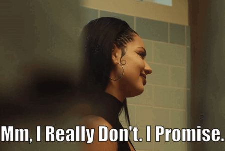 Maddy Perez from Euphoria, portrayed by Alexa Demie, saying 'Mm, I Really Don't. I Promise.'