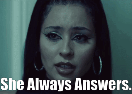 a close up of a woman with the words she always answers