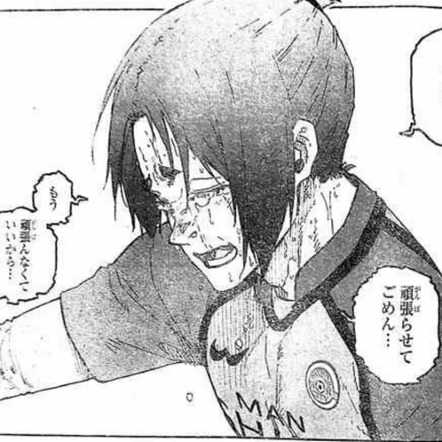 Reo Mikage from Blue Lock shown in an emotional manga panel, crying and sweating with determination.