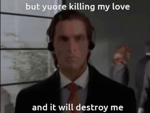 Patrick Bateman walks through an office hallway, wearing headphones, with the caption 'but you're killing my love and it will destroy me'.