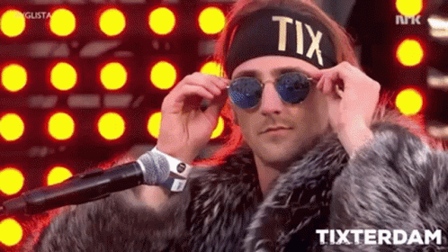 Norwegian artist TIX adjusts his sunglasses while performing at Eurovision, wearing a fur coat and 'TIX' headband.