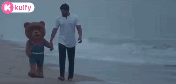 Actor Arya and a teddy bear mascot walk hand-in-hand on a serene beach during an evening stroll.