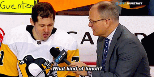 Hockey player Evgeni Malkin is interviewed, humorously asking 'What kind of lunch?' during the conversation.