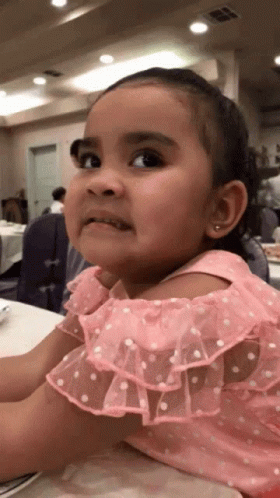 A little girl in a pink polka dot dress makes a hilariously disgusted 'Eww Oh God' face at the table.