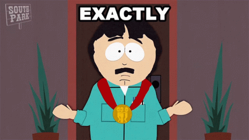 Randy Marsh from South Park, wearing a medal, emphatically states 'Exactly' to the viewer.
